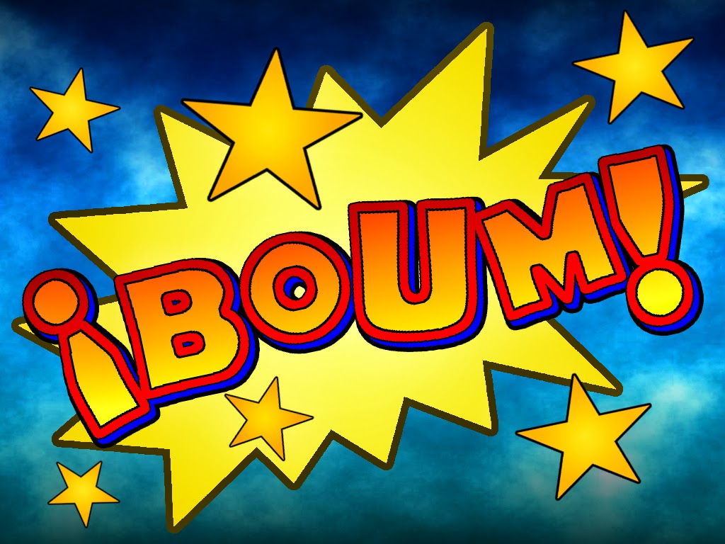 Y para acabar una viñeta típica de los comics de humor, una onomatopeya de una explosión, en la que he utilizado las formas predeterminadas para hacer las estrellas y el bocadillo del fondo.